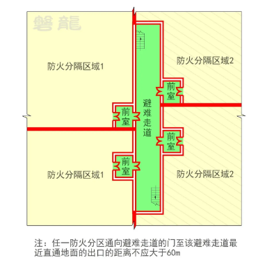 (2)疏散走道的隔墙需满足相应耐火等级建筑的燃烧性能和耐火极限要求;