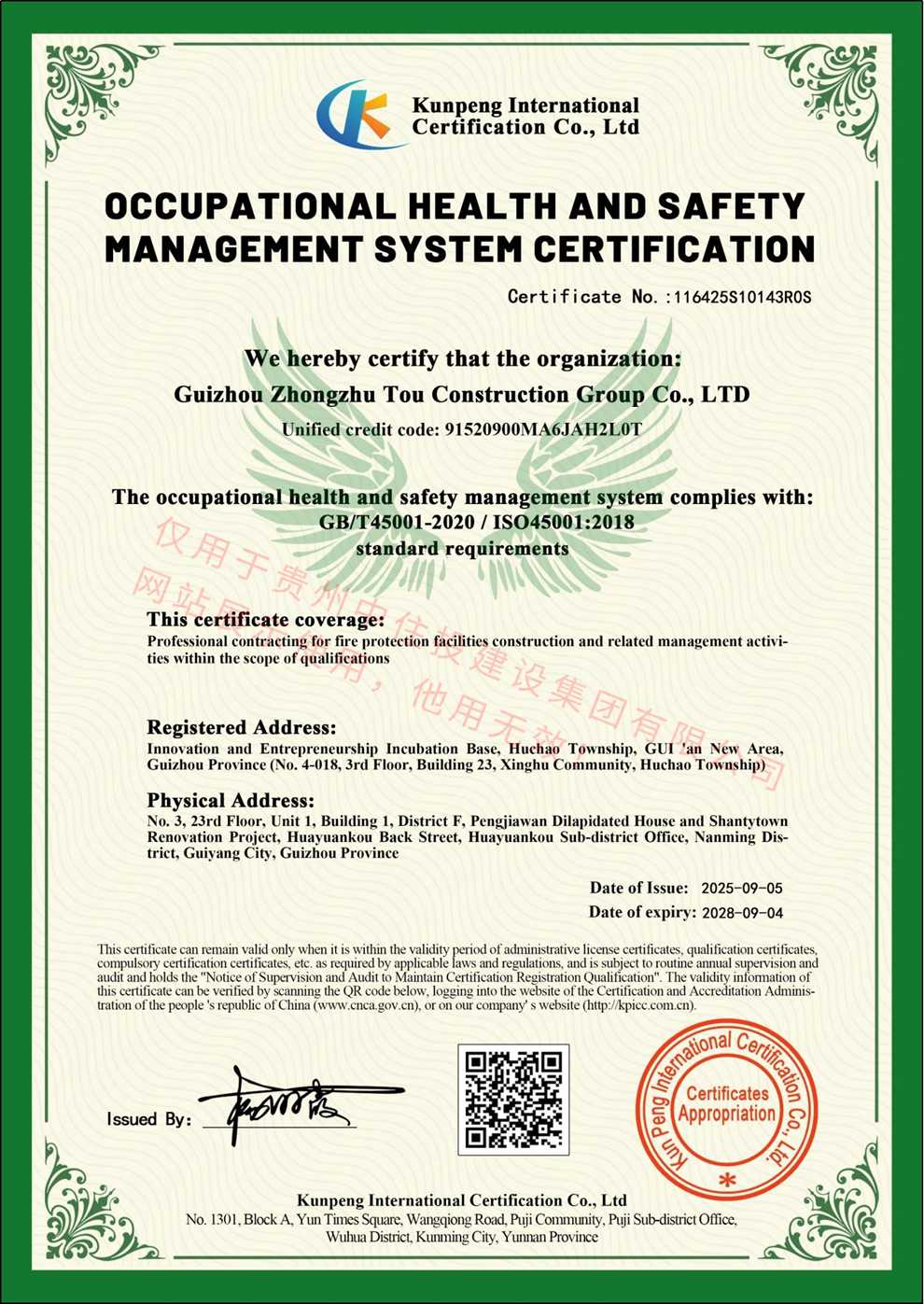 职业健康安全管理体系认证证书